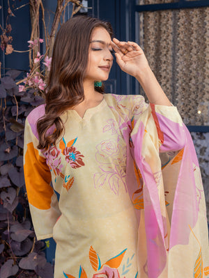 Step into a world of sophisticated charm with this beautifully crafted three-piece ensemble. The serene cream base acts as a perfect canvas for a vibrant, artistic floral print that blossoms across the fabric in radiant hues of orange, delicate pink, and soft lilac. This suit set is designed for the modern woman who appreciates both style and comfort.