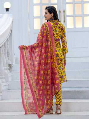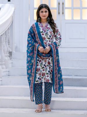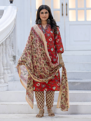 Crimson Bloom Floral Printed Cotton Kurta Set with Dupatta
