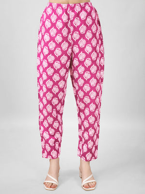 Brighten up your ethnic wardrobe with this Pink Printed Cotton Suit Set, designed to keep you stylish and comfortable all day long. The kurta features a lively floral print in white on a bold pink base, accentuated with button detailing on the front for added charm. Paired with a contrasting printed pant for a trendy edge, the outfit is completed with a lightweight pink dupatta featuring subtle woven stripes that enhance its graceful appeal.
