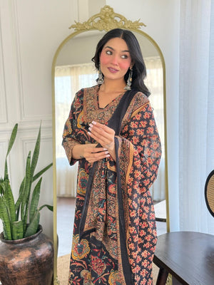 Paired with coordinating straight-fit pants that echo the same captivating print, this set promises both comfort and a seamless, polished look. Completing the attire is an ethereal, lightweight dupatta. Its sheer black fabric allows the intricate, wide borders to stand out, framing you in elegance and tying the entire look together perfectly.