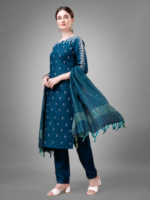 Step into timeless elegance with this Mehendi Green Embroidered Cotton Suit Set, designed to add charm to your ethnic wardrobe. Crafted from soft and breathable cotton fabric, the kurta features delicate white thread embroidery spread across the front and sleeves, giving it a sophisticated yet subtle appeal. The straight-cut kurta is paired with a matching bottom for a comfortable fit, while the lightweight dupatta with fine woven stripes completes the look beautifully.