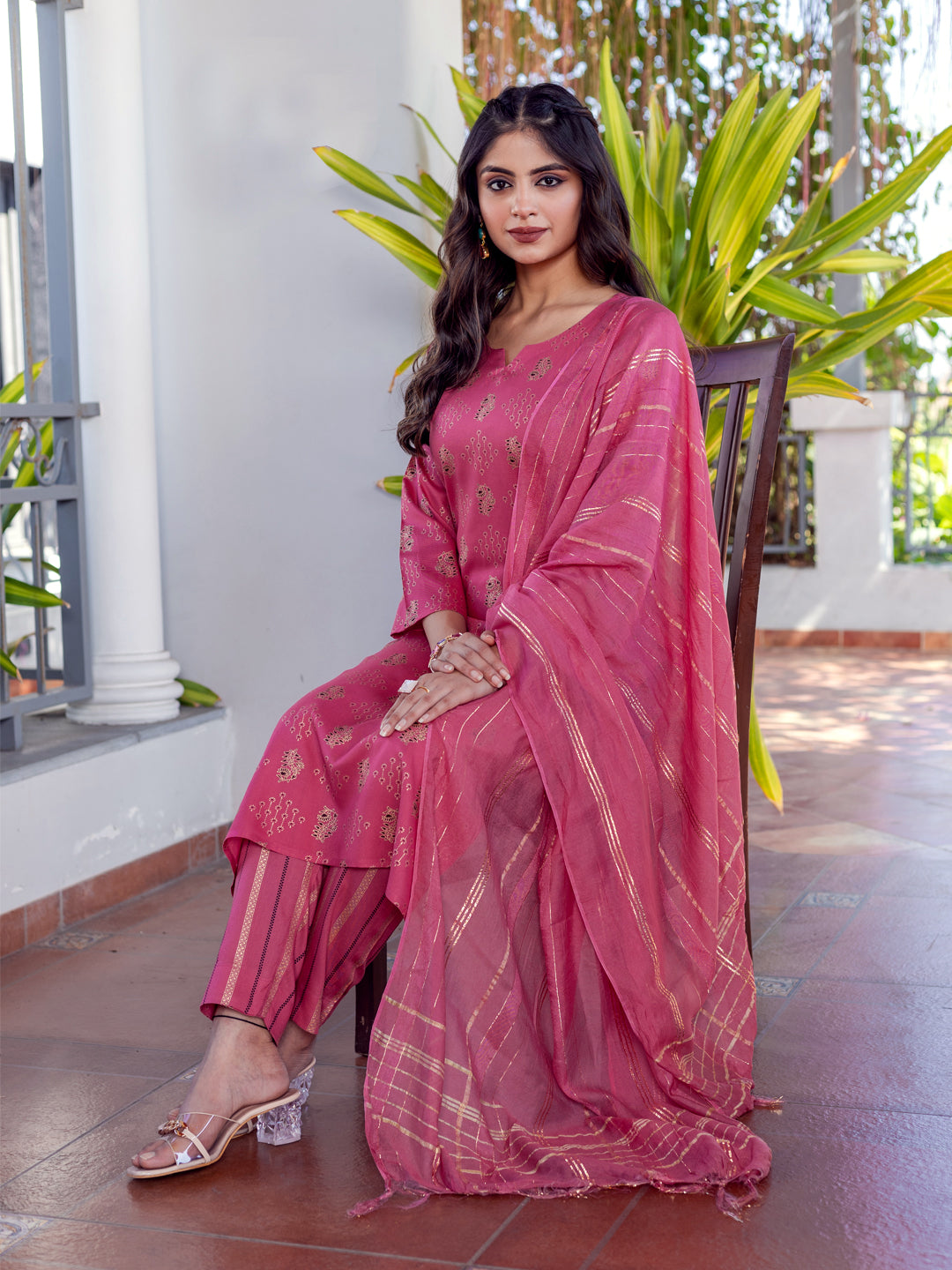Bring sophistication to your ethnic collection with this a perfect blend of comfort and elegance. The kurta features intricate geometric and floral-inspired prints in shades of blue, pink, and gold, adding a contemporary charm to its classic black base. It is paired with a matching printed bottom that ensures both style and ease of movement. The lightweight black dupatta with subtle woven patterns completes the outfit, giving it a graceful finish.
