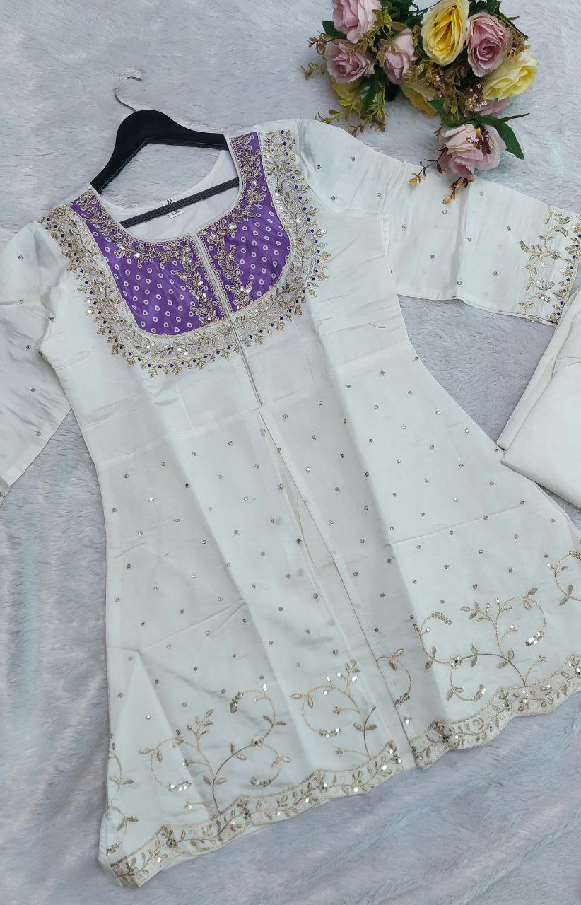 This set features a stunning kurta with a pleated hemline and a front slit, offering a flattering silhouette. The neckline is a true standout, with intricate embroidery and beading that adds a pop of vibrant color in either a rich fuchsia pink or a striking royal purple. The subtle all-over beading on the kurta adds a touch of sparkle that catches the light beautifully. Paired with wide-legged plazzo pants, this outfit ensures comfort without sacrificing style.