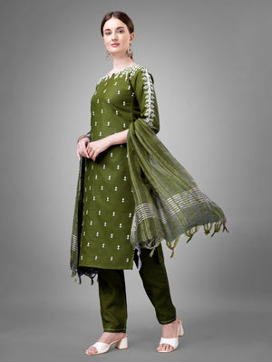 Elegant Mehendi Green Embroidered Cotton Suit Set with Dupatta