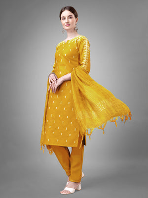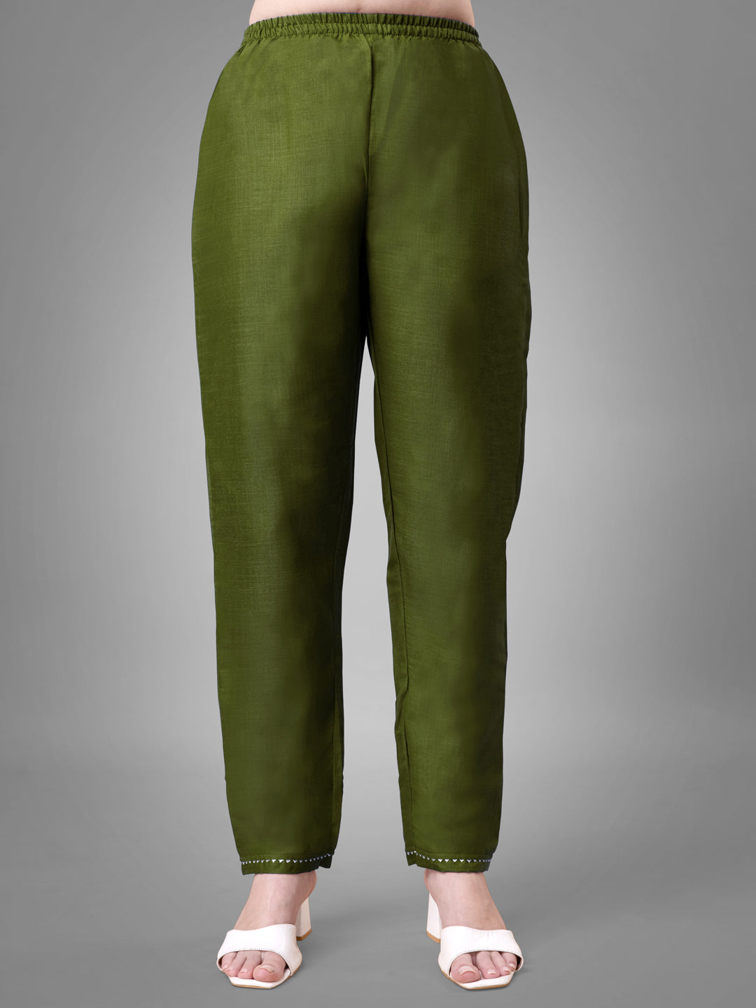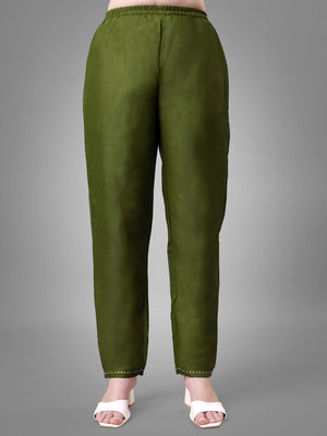 Step into timeless elegance with this Mehendi Green Embroidered Cotton Suit Set, designed to add charm to your ethnic wardrobe. Crafted from soft and breathable cotton fabric, the kurta features delicate white thread embroidery spread across the front and sleeves, giving it a sophisticated yet subtle appeal. The straight-cut kurta is paired with a matching bottom for a comfortable fit, while the lightweight dupatta with fine woven stripes completes the look beautifully.