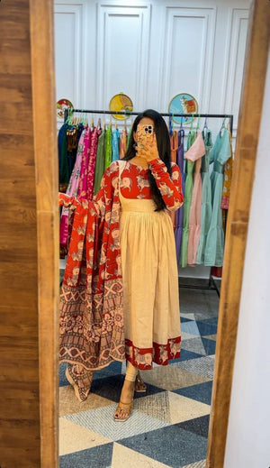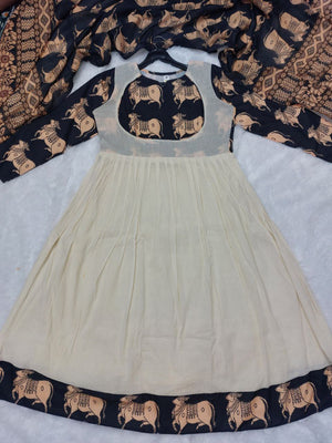 Step out in a symphony of tradition and playful charm with our Gaja Anarkali Set. This stunning ensemble celebrates the timeless, flattering Anarkali silhouette while showcasing a whimsical, heritage-inspired elephant block print that is sure to capture hearts. Designed for the modern woman who loves a touch of artisanal elegance, this set is available in two exquisite colorways: a classic Black & Beige and a vibrant Red & Beige.