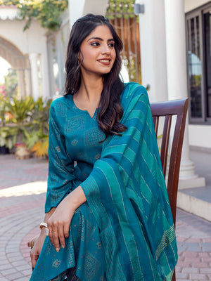 Bring sophistication to your ethnic collection with this  a perfect blend of comfort and elegance. The kurta features intricate geometric and floral-inspired prints in shades of blue, pink, and gold, adding a contemporary charm to its classic black base. It is paired with a matching printed bottom that ensures both style and ease of movement. The lightweight black dupatta with subtle woven patterns completes the outfit, giving it a graceful finish.